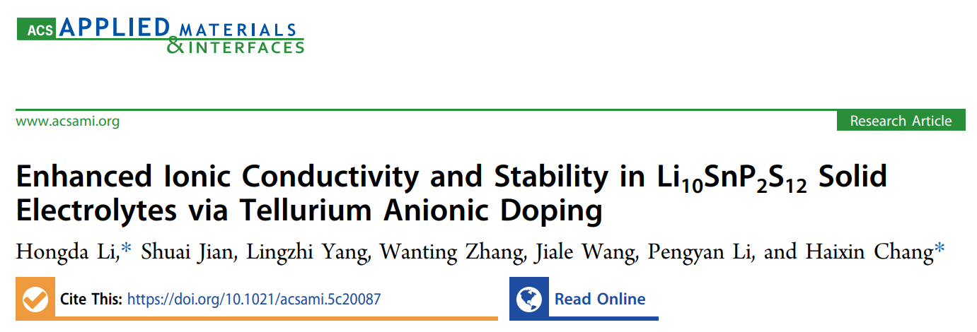 2025年11-12月,ACS Applied Materials & Interfaces(美国化学会《应用材料与界面》)和Journal of Materials Chemistry A(《材料化学A》)分别在线发表了该团队题为“Enhanced Ionic Conductivity and Stability in Li10SnP2S12 Solid Electrolytes via Tellurium Anionic Doping”(碲阴离子掺杂提高Li10SnP2S12固态电解质的离子导电率和稳定性)和“Heterovalent doping of amorphous oxyhalide solid electrolytes for high-performance all-solid-state lithium batteries”(异价掺杂无定形氧卤化物固体电解质用于高性能全固态锂电池)的研究论文。李宏达博士分别为论文第一/通讯作者和第一作者,bv1946伟德均为论文第一通讯单位;华中科技大学常海欣教授分别为论文的共同通讯作者和唯一通讯作者。ACS Applied Materials & Interfaces是中科院二区TOP期刊,最新影响因子为8.2;Journal of Materials Chemistry A是中科院二区TOP期刊,最新影响因子为9.5。